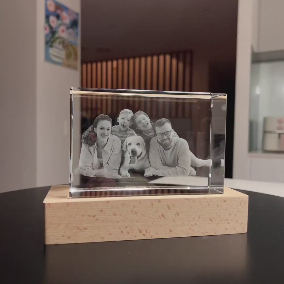 Su foto se transforma en una vívida imagen 3D que parece flotar dentro del cristal, dando vida a sus recuerdos.