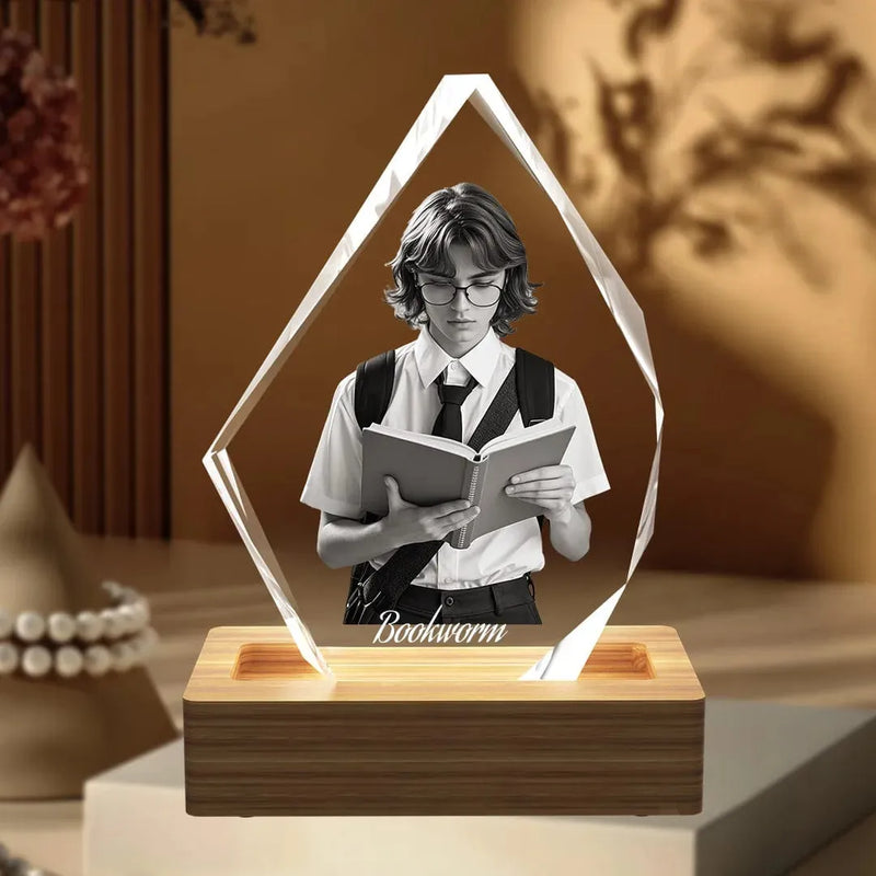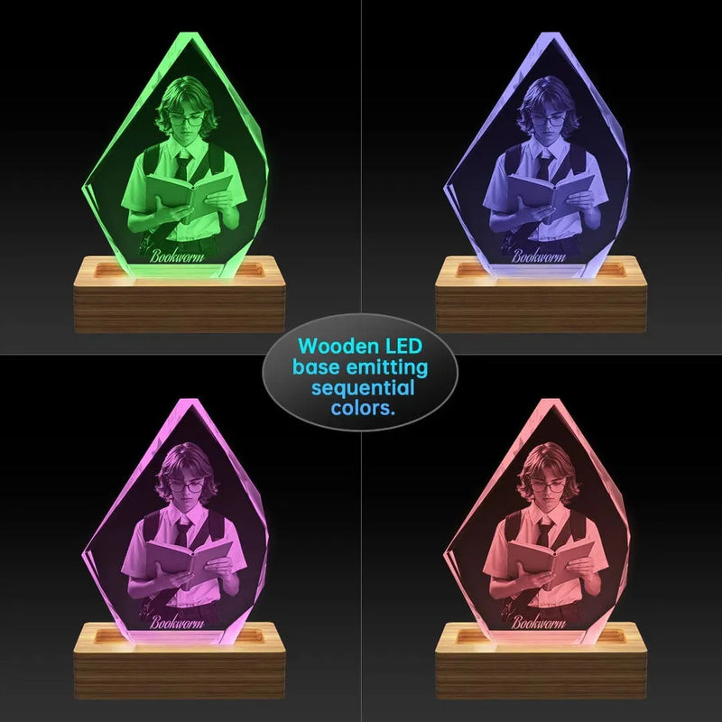 Iceberg-style crystal photo gift on wooden LED base – natural texture meets brilliant light, made in Australia