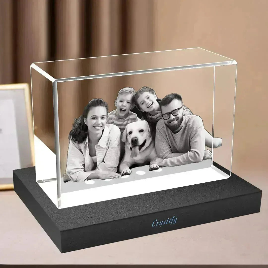 Each frame is engraved using precision 3D laser technology that brings your photo to life within the depth of premium K9 crystal. The result is a floating, detailed rendering of your image—beautifully preserved in light and form, viewable from every angle.